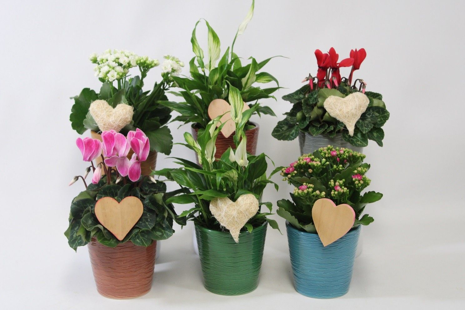 Kalanchoe en Spathiphyllum in papier manchet met bijsteker. Valentijn, Moederdag en Vrouwendag, D 10,5