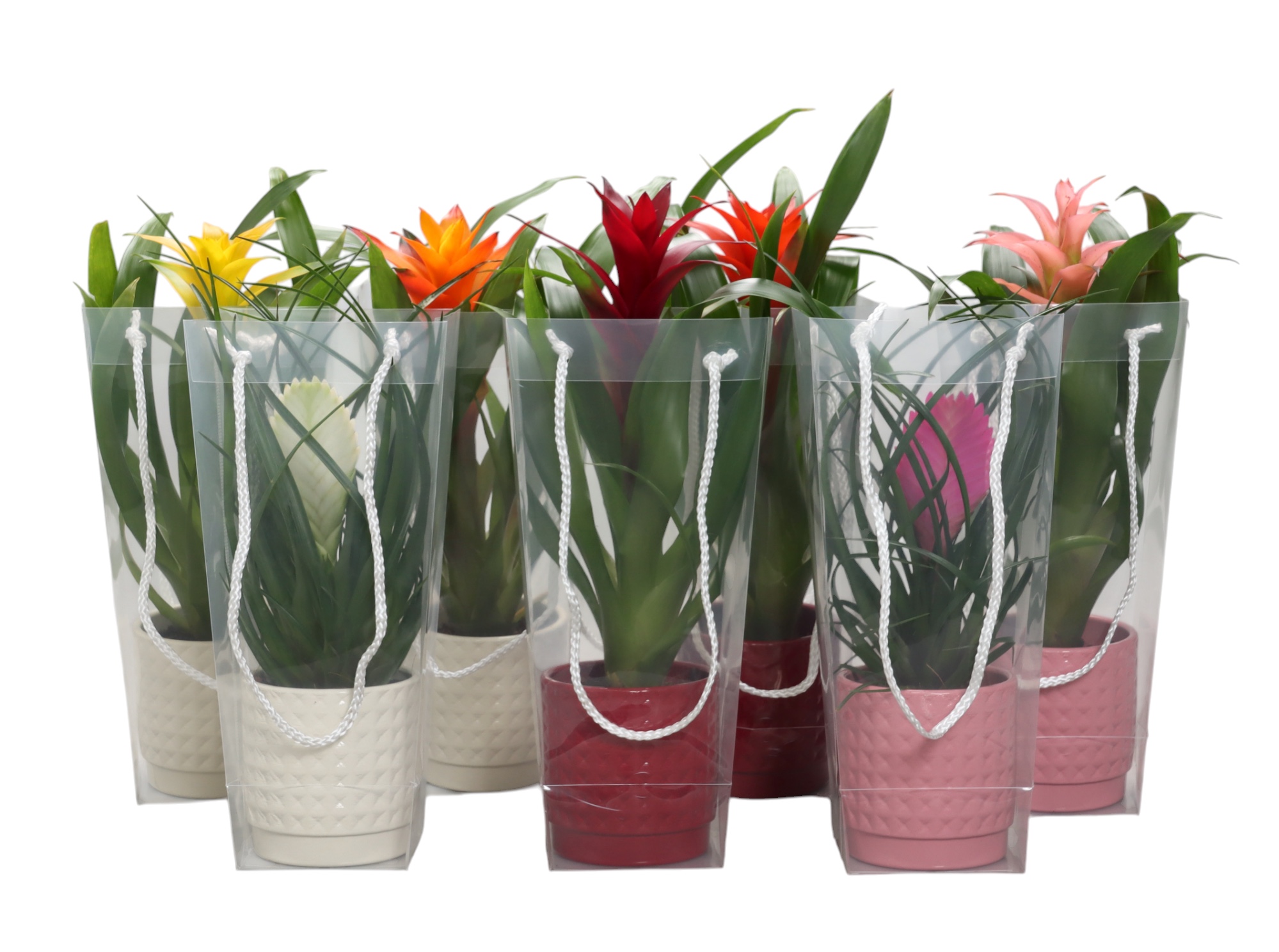 Guzmania gemengd in rood en wit ruit keramiek in blanco draagtas, D 10