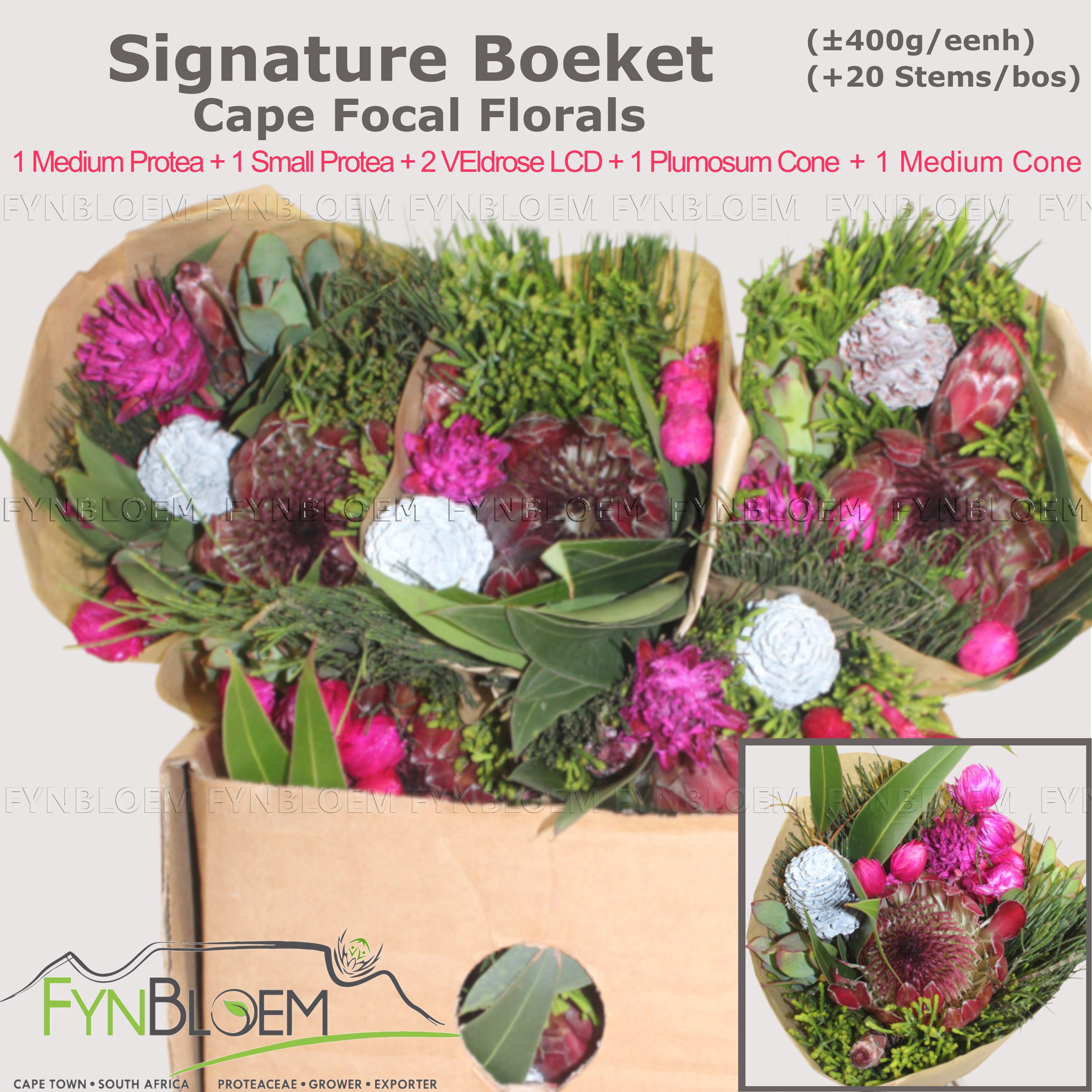 Signature 1 Medium Protea + 1 Small Protea + 2 Veldrose LCD + 1 Plumosum Cone + 1 Medium Cone Bouquet