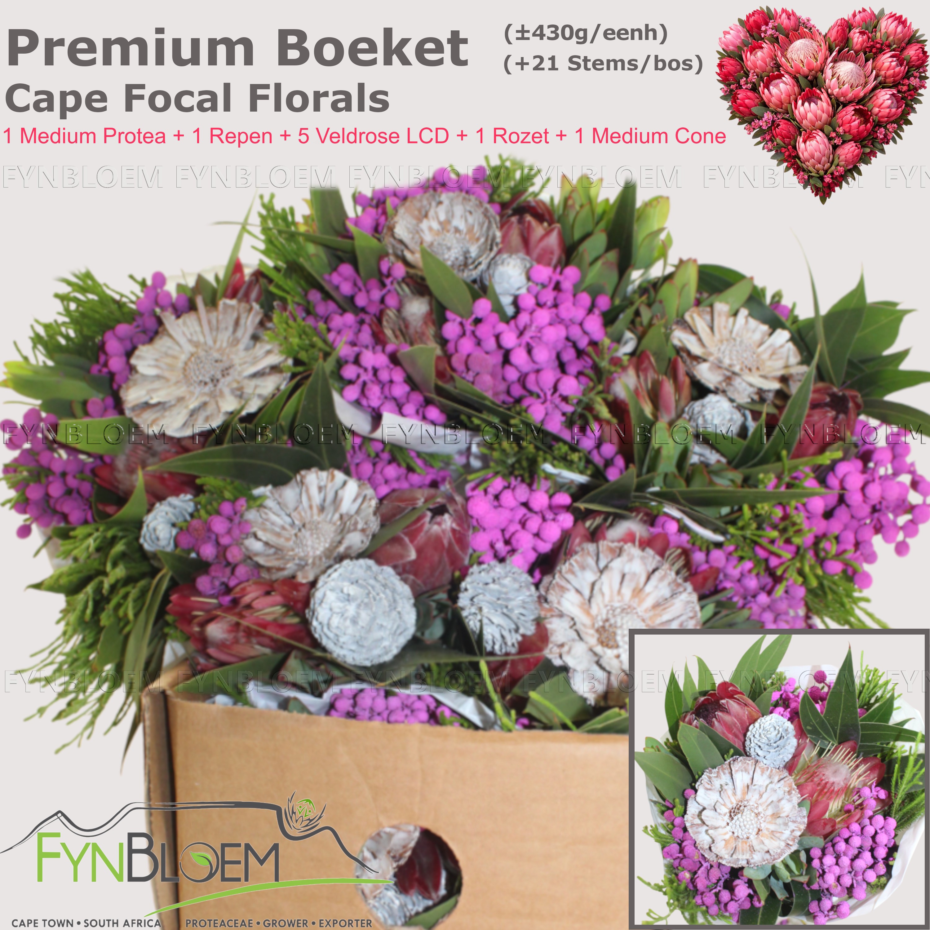 Valentines Premium 1 Medium Protea + 1 Repen + 5 Veldrose LCD + 1 Rozet + 1 Medium Cone Bouquet |